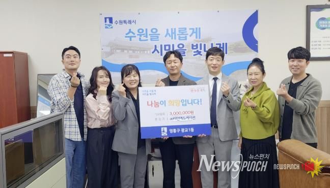 뉴스펀치 탁상훈 기자 | 수원시 영통구 광교1동은 ㈜이언에듀케이션으로부터 이웃돕기 성금 300만원을 기탁받았다고 밝혔다.