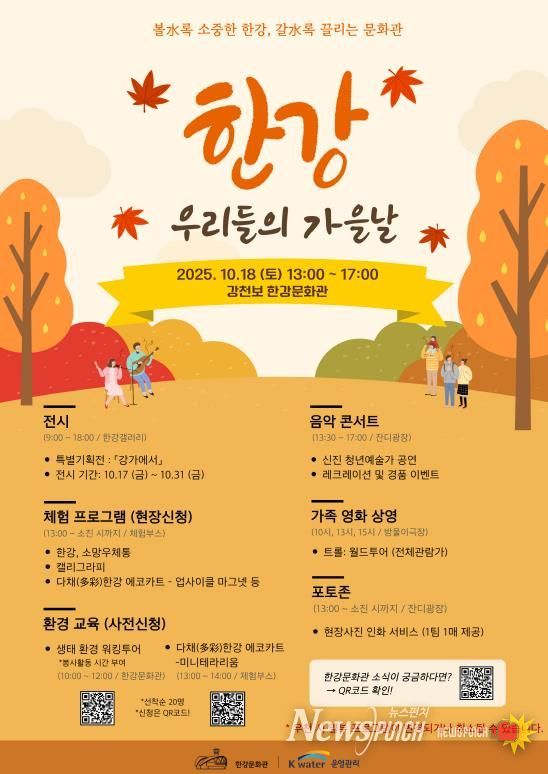 뉴스펀치 탁상훈 기자 | K-water한강보관리단과 케이워터운영관리 한강문화관은 오는 10월 18일 가족과 이웃이 함께 즐기는 대표 문화축제 “한강, 우리들의 가을날”를 개최한다고 밝혔다