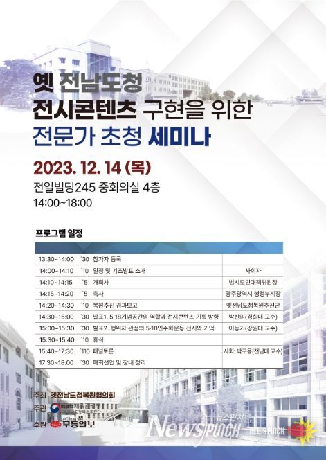 뉴스펀치 김희경 기자 | 문화체육관광부와 광주광역시, 옛전남도청복원범시도민대책위로 구성한 옛전남도청복원협의회는 12월 14일 오후 2시, 전일빌딩245 중회의실에서 ‘옛 전남도청 전시콘텐츠 구현을 위한 전문가 초청 세미나’를 개최한다.