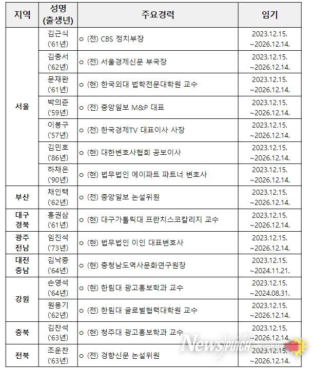 뉴스펀치 김희경 기자 | 문화체육관광부 유인촌 장관은 언론중재위원회 중재위원의 임기만료 및 사임에 따라 2023년 12월 15일 자로 중재위원 15명을 위촉한다. 위원의 임기는 3년이며, 사임한 위원의 후임자는 전임자의 남은 임기를 승계한다.