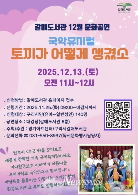 뉴스펀치 김길룡 기자 | 구리시 갈매도서관은 국악뮤지컬 '토끼가 어떻게 생겼소' 무료 관람 사전 신청을 11월 25일부터 갈매도서관 홈페이지에서 선착순으로 신청받는다고 밝혔다.