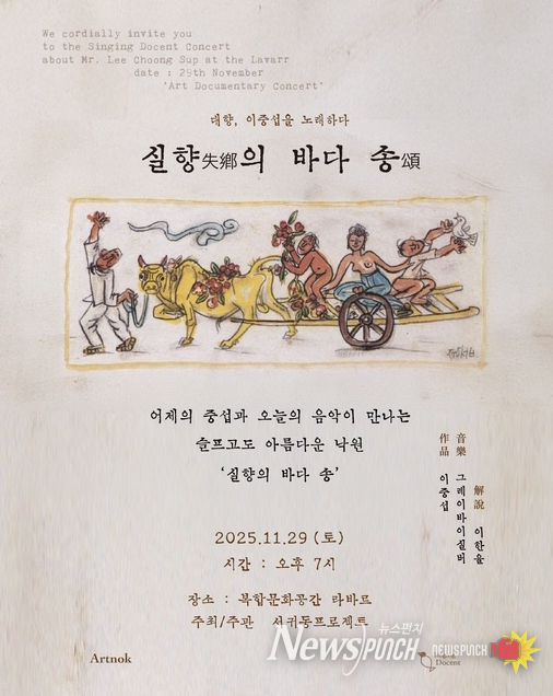 뉴스펀치 김길룡 기자 | 서귀포시 정방동은 11월 29일, 서귀포시 중앙로 13 복합문화공간 워크라운지에서 '대향, 이중섭을 노래하다 ‘실향의 바다 송’' 문화·예술 공연을 개최한다고 밝혔다.