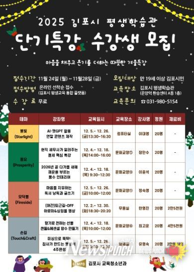 뉴스펀치 김길룡 기자 | 김포시는 ‘따뜻한 연말’을 주제로 시민의 정서적 힐링과 실생활에 유용한 학습 기회 제공을 위해, ‘2025년 하반기 평생학습관 단기특강 수강생’을 오는 11월 24일부터 선착순으로 모집한다.