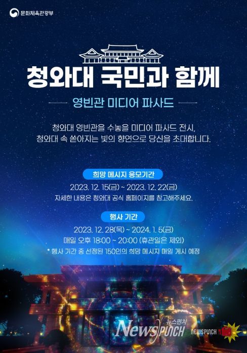 뉴스펀치 김희경 기자 | 문화체육관광부는 연말을 맞이해 2023년 한 해를 돌아보고 국민과 함께 청와대를 생동감 있게 만들고자 12월 27일부터 2월 29일까지 영상 전시회 ‘청와대 국민과 함께’를 진행한다.