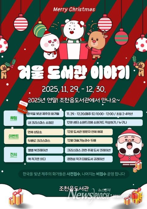 뉴스펀치 김길룡 기자 | 제주시 조천읍도서관은 지역 주민에게 따뜻한 겨울의 추억을 선사하기 위해 11월 29일부터 12월 30일까지 송년 특별 프로그램 ‘겨울 도서관 이야기’를 운영한다.