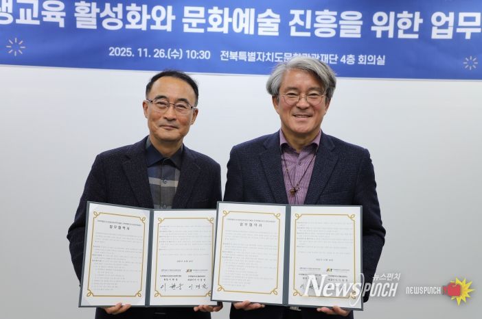 뉴스펀치 김길룡 기자 | 전북특별자치도평생교육장학진흥원과 전북특별자치도문화관광재단은 11월 26일, 전북문화관광재단 회의실에서 평생학습과 문화예술 분야의 공동 발전을 목표로 업무협약(MOU)을 체결했다.