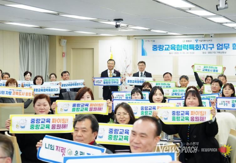 뉴스펀치 김완규 기자 | 중랑구는 11월 26일 구청 4층 기획상황실에서 서울특별시교육청과 ‘중랑교육협력특화지구’업무협약을 체결했다. 이번 협약은 2019년 혁신교육지구, 2023년 미래교육지구 추진에 이어 지역 교육 협력사업을 확장하는 단계로, 구·교육청·학교 간 협력 구조를 체계화해 지역 기반 교육 환경을 강화하기 위해 마련됐다.