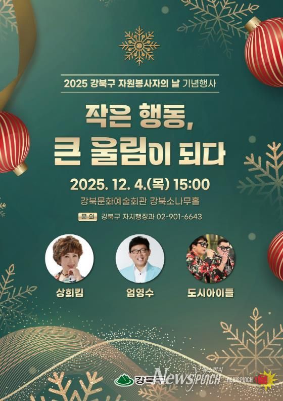 뉴스펀치 김완규 기자 | 서울 강북구는 오는 12월 4일 강북문화예술회관 강북소나무홀에서 ‘2025 자원봉사자의 날 기념 행사’를 개최한다.