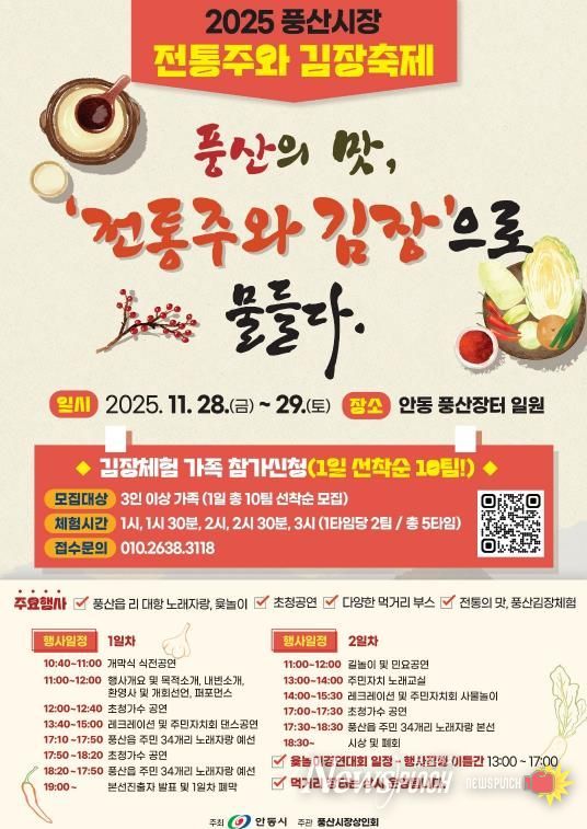 뉴스펀치 김길룡 기자 | 안동시는 지역 고유의 맛과 겨울철 전통문화를 함께 즐길 수 있는 ‘2025 풍산시장 전통주와 김장축제’를 11월 28일부터 29일까지 이틀간 풍산장터 일원에서 개최한다고 밝혔다. 개막식은 28일 오전 11시에 열린다.