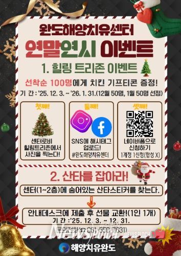 참가 방법은 12월 1일부터 22일까지 네이버 폼을 통해 사전 신청해야 하며, 자세한 내용은 완도해양치유센터 누리집 공지 사항을 통해 확인할 수 있다.