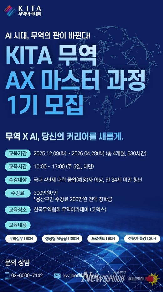 오는 12월 9일부터 시작하는 ‘제1기 무역 AX(AI & Trade eXpert Master) 마스터 과정’은 급변하는 세계 무역환경에 대응할 수 있도록 인공지능(AI)을 활용한 실무형 청년 무역 인재를 양성하고, 수료 후 국내·외 중견기업 취업 연계를 목표로 한다. 용산구는 이 교육과정을 수료한 용산구민을 대상으로 1인당 200만 원의 교육비를 전액 지원한다.