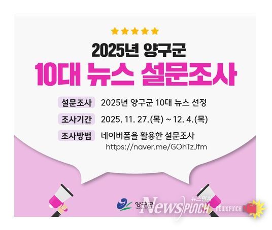 뉴스펀치 김길룡 기자 | 양구군이 올 한 해 최대 관심과 공감을 받은 ‘올해의 10대 뉴스’를 선정하기 위해 오는 4일까지 주민 설문조사를 실시한다.