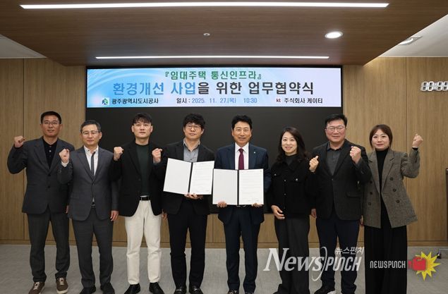 뉴스펀치 김길룡 기자 | 광주도시공사(사장 김승남)는 27일 빛고을고객센터에서 주식회사 케이티(광주지사장 김태오)과 함께 임대주택 통신인프라 환경개선을 위한 업무협약(MOU)을 체결했다.