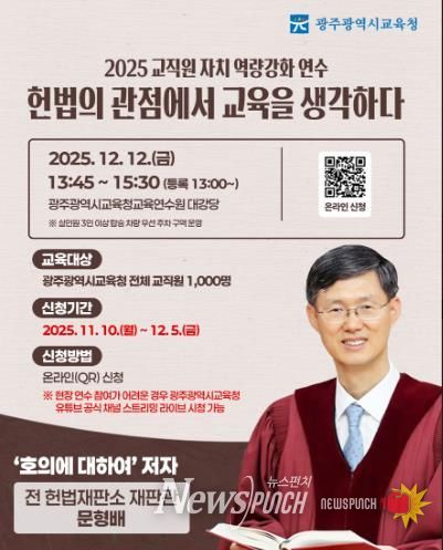 뉴스펀치 김길룡 기자 | 광주시교육청은 오는 12일 오후 1시45분부터 광주시교육청교육연수원 대강당에서 문형배 전 헌법재판관을 초빙해 ‘교직원 자치 역량 강화 연수’를 개최한다.