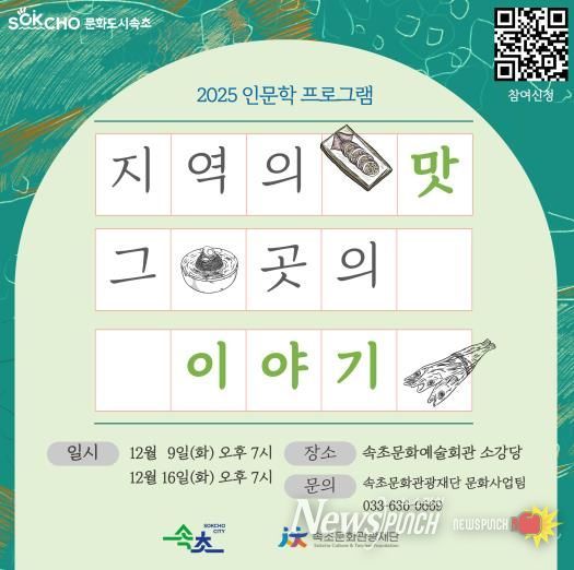 재단 관계자는 “지역의 맛과 이야기를 통해 속초의 문화적 정체성과 시민들의 일상을 다시 바라보는 시간이 되길 바란다”며 “연말을 앞두고 준비한 인문학 특강에 많은 관심과 참여를 부탁드린다”고 말했다.