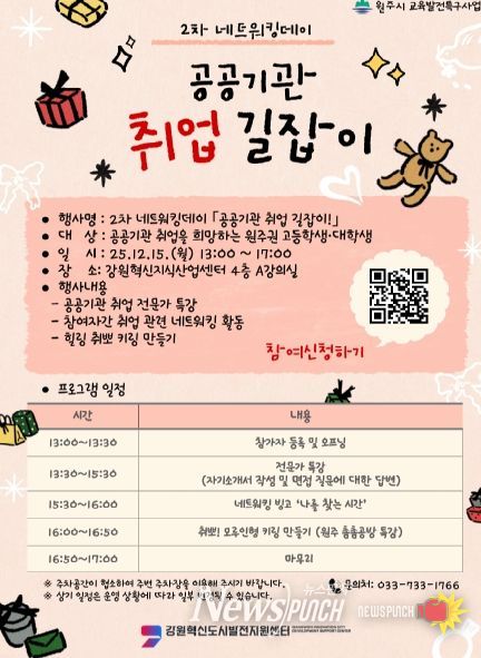 뉴스펀치 김길룡 기자 | 강원혁신도시발전지원센터는 원주시 교육발전특구 위탁사업의 일환으로, 오는 12월 15일 오후 1시부터 5시까지 센터 4층 에이(A)강의실에서 2차 네트워킹데이 '공공기관 취업 길잡이'를 개최한다.