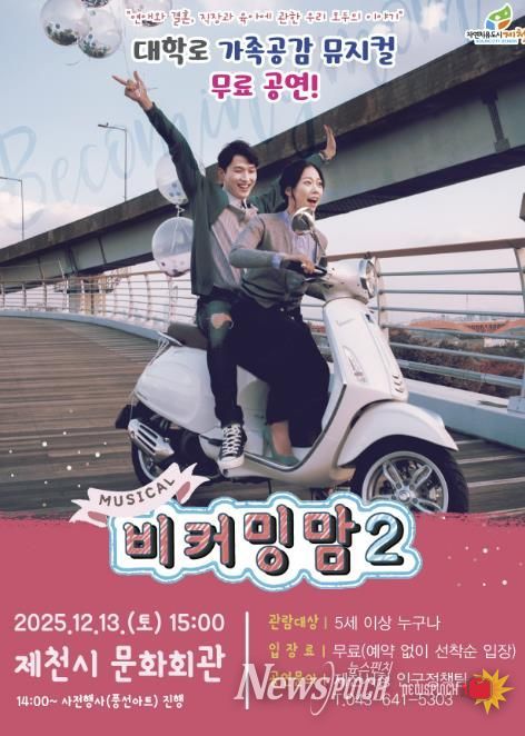 뉴스펀치 김길룡 기자 | 제천시는 인구문제에 대한 사회적 공감대를 형성하고 가족의 소중함을 되새기기 위한 ‘가족 뮤지컬 『비커밍맘2』’를 오는 12월 13일 오후 3시, 제천시 문화회관에서 개최한다. 이번 공연은 누구나 관람할 수 있는 무료 공연으로, 별도의 예약 없이 선착순 입장이 가능하다.