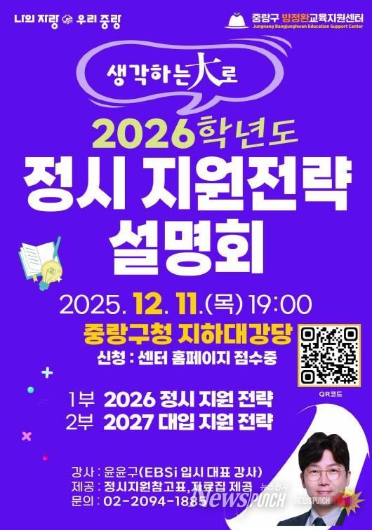 뉴스펀치 김완규 기자 | 중랑구는 대학교 진학을 앞둔 수험생과 학부모를 대상으로 오는 12월 11일 목요일 오후 7시 중랑구청 지하 대강당에서 녪학년도 대입 정시 지원 전략 설명회’를 개최한다.