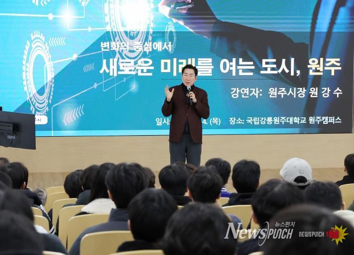 뉴스펀치 김길룡 기자 | 원강수 원주시장은 지난 4일 국립강릉원주대학교 원주캠퍼스에서 강원원주산학융합지구 소속 학부생 160여 명을 대상으로 ‘변화의 중심에서 새로운 미래를 여는 도시, 원주’라는 주제로 특별 강연을 진행했다.