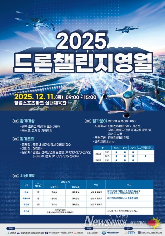 뉴스펀치 김길룡 기자 | 영월군은 관내 여러 기관과 협력해 12월 11일 목요일 오전 9시부터 오후 3시까지 영월스포츠파크 실내체육관에서 ‘2025 드론 챌린지 영월’을 개최한다고 밝혔다.
