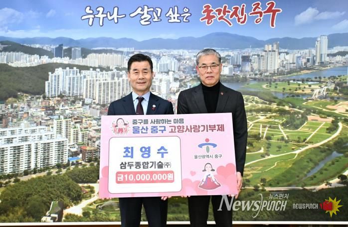 뉴스펀치 김길룡 기자 | 최영수 삼두종합기술㈜ 대표가 12월 11일 오후 4시 중구청 구청장실을 방문해 고향사랑기부금 1,000만 원을 전달했다.