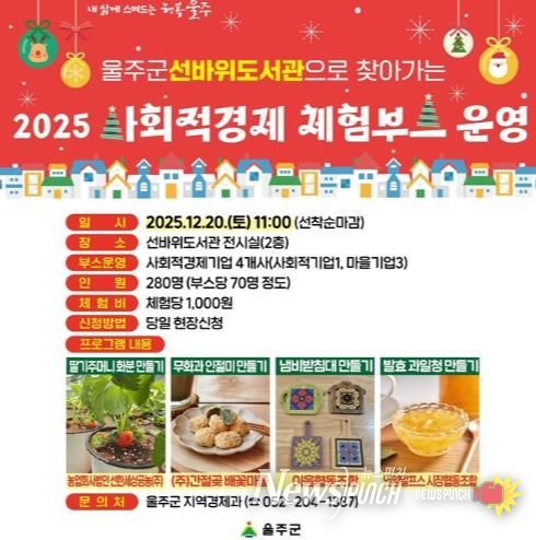 뉴스펀치 김길룡 기자 | 울산 울주군이 오는 20일 선바위도서관 2층 전시실에서 ‘선바위도서관으로 찾아가는 사회적경제 체험부스’를 운영한다고 12일 밝혔다.