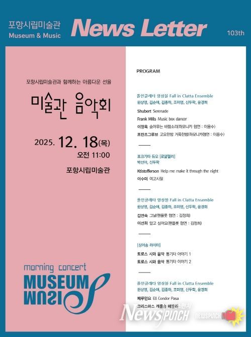 뉴스펀치 김길룡 기자 | 포항시립미술관은 오는 18일 오전 11시, 제103회 미술관 음악회 ‘MUSEUM · MUSIC’를 개최한다.