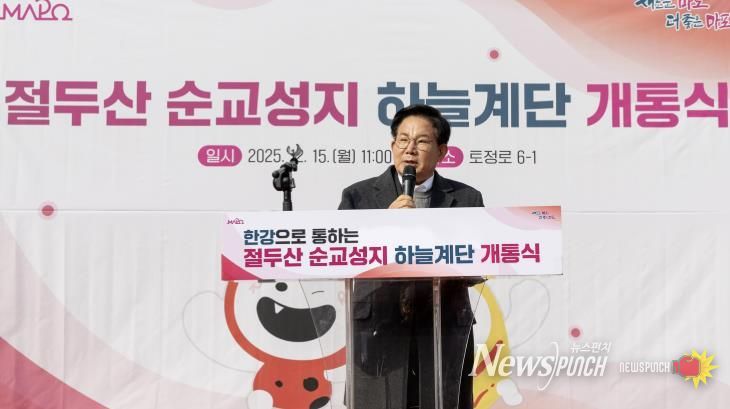 뉴스펀치 김완규 기자 | 마포구는 절두산 순교성지를 찾는 방문객들의 보행 안전을 높이고 성지의 역사적·문화적 가치를 높이기 위해 ‘절두산 순교성지 하늘계단 정비공사’를 추진하고, 12월 15일 개통식을 개최했다.