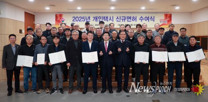 뉴스펀치 김길룡 기자 | 용인특례시는 16일 시청 비전홀에서 ‘2025년도 개인택시운송사업 신규 면허증 수여식’을 개최하고, 신규 면허자 35명에게 면허증을 전달했다.
