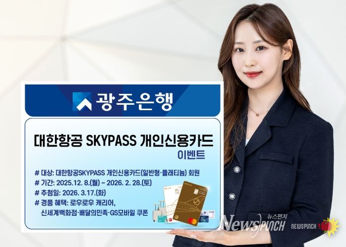 뉴스펀치 김길룡 기자 | 광주은행은 2025년 12월 8일부터 2026년 2월 28일까지 ‘하늘길을 채우는 대한항공SKYPASS개인신용카드 이벤트’를 진행한다고 밝혔다.