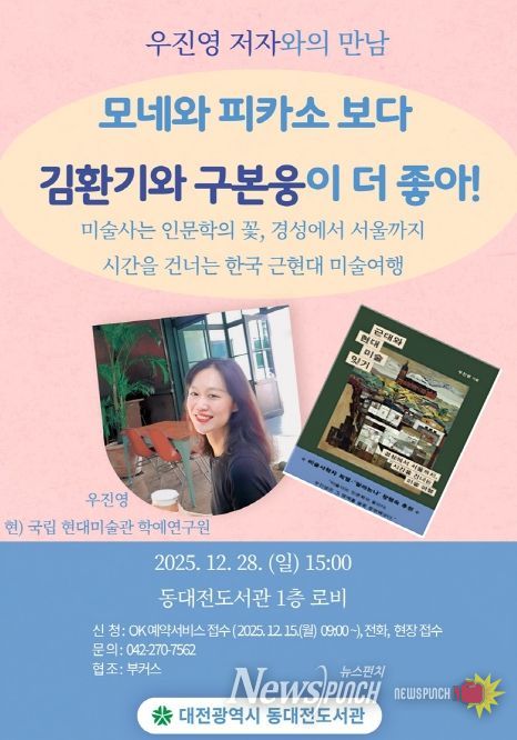 뉴스펀치 김길룡 기자 | 동대전도서관은 연말을 맞아 시민들을 위해 특별한 인문학 강연 '모네와 피카소보다 김환기와 구본웅이 더 좋아!'를 28일 15시에 1층 로비에서 개최한다.