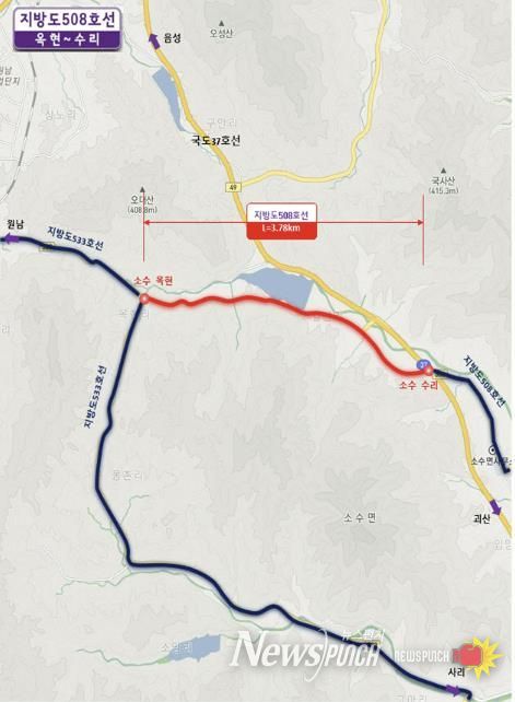 뉴스펀치 김길룡 기자 | 충북 괴산군은 지방도508호선 소수면 옥현리에서 수리를 연결하는 ‘옥현~수리 도로개량공사 기본 및 실시설계용역’에 착수한다고 17일 밝혔다.