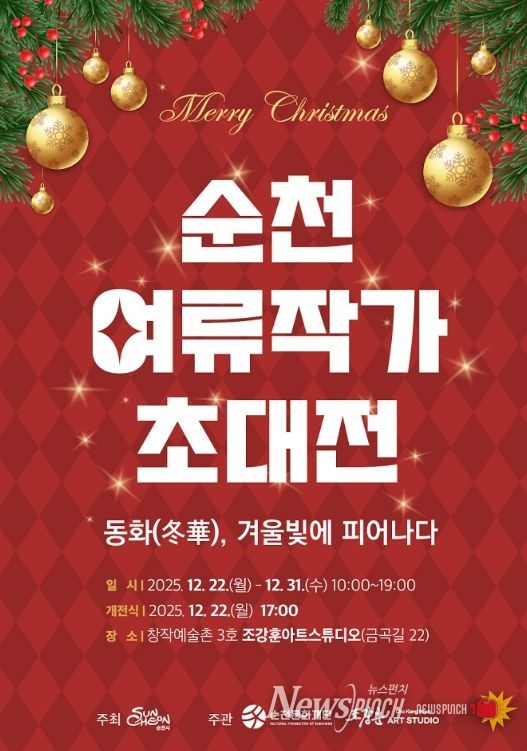 뉴스펀치 김길룡 기자 | 순천문화재단은 오는 22일 오후 5시 개전식을 시작으로 31일까지 순천창작예술촌 3호 조강훈 아트 스튜디오 1층 전시관에서 순천 여류작가 초대전 「동화(冬華), 겨울빛에 피어나다」를 진행한다.