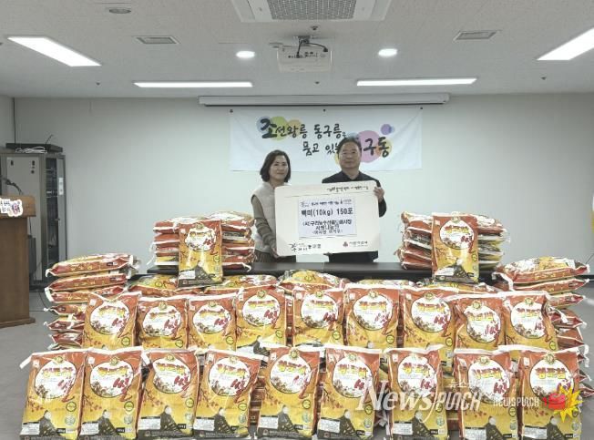 뉴스펀치 김길룡 기자 | 구리시 동구동은 지난 16일 동구동 행정복지센터 대회의실에서 (사)구리농수산물도매시장 사랑나눔단으로부터 관내 취약계층을 위한 백미(10kg) 150포를 전달받았다.