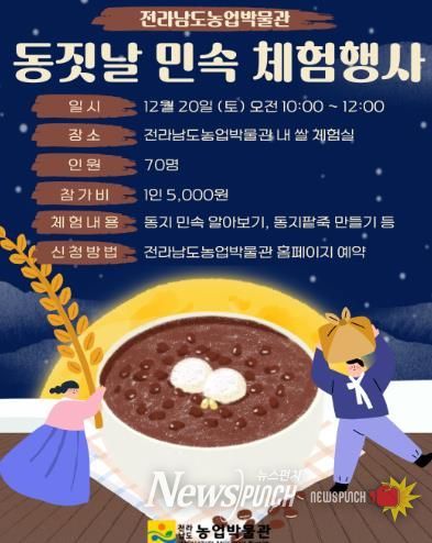 뉴스펀치 김길룡 기자 | 전라남도농업박물관은 잊혀가는 전통 절기 문화인 동짓날의 의미를 되새기기 위해 21일 오전 10시부터 12시까지 박물관 쌀 체험실에서 ‘동짓날 민속 체험행사’를 연다.