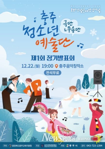 뉴스펀치 김길룡 기자 | 충주문화관광재단은 12월 22일 저녁 7시, 충주음악창작소에서 충주 청소년 예술단(극단·무용단) 제1회 정기발표회를 개최한다고 밝혔다.