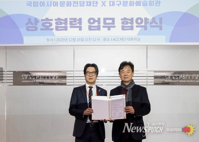 뉴스펀치 조평훈 기자 | 대구문화예술회관은 국립아시아문화전당재단과 12월 16일 ACC재단 대회의실에서 지역 문화예술 상생발전 및 유기적 협력 도모를 위하여 업무협약을 체결했다.