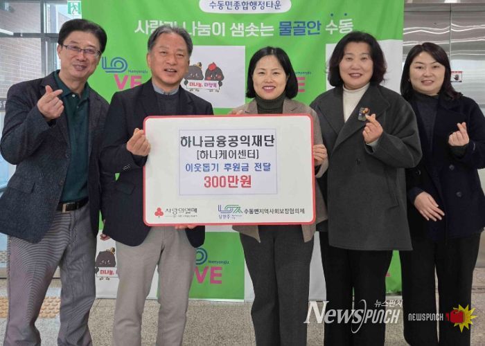 뉴스펀치 김길룡 기자 | 남양주시는 17일 하나금융공익재단이 어려운 이웃을 위해 후원금 300만 원을 수동면 지역사회보장협의체에 지정 기탁했다고 밝혔다.