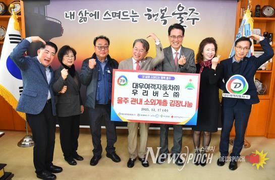 뉴스펀치 김길룡 기자 | 대우여객자동차(주) 우리버스(주)가 17일 울주군 저소득층을 위해 김장김치 5㎏ 50개를 전달했다.