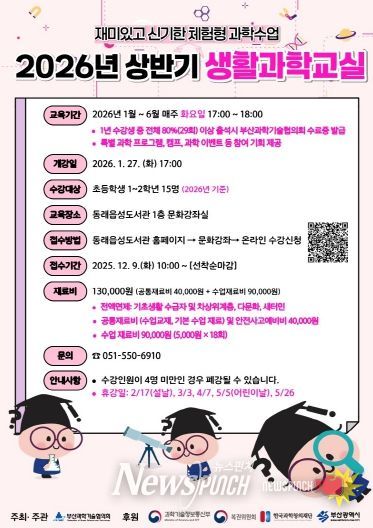 뉴스펀치 김길룡 기자 | 부산 동래구는 2026년 1월부터 동래읍성도서관과 안락누리도서관, 온빛어린이 작은도서관에서 부산과학기술협의회와 연계해 관내 초등학생을 대상으로 ‘생활과학교실'을 운영한다고 밝혔다.