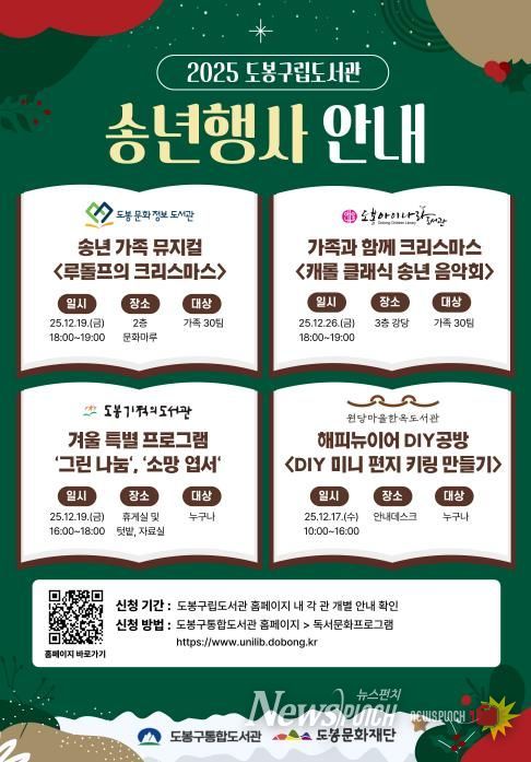 원당마을한옥도서관은 12월 17일 ‘DIY 미니 편지 키링 만들기’ 행사를, 도봉문화정보도서관은 12월 19일 송년 가족 뮤지컬 ‘루돌프의 크리스마스’ 공연을, 도봉기적의도서관은 12월 19일 도서관 식물 나눔 ‘그린 나눔’, ‘도서관에서 쓰는 새해 소망 엽서’ 행사를, 도봉아이나라도서관은 12월 26일 ‘캐롤 클래식 송년 음악회’를 진행한다.