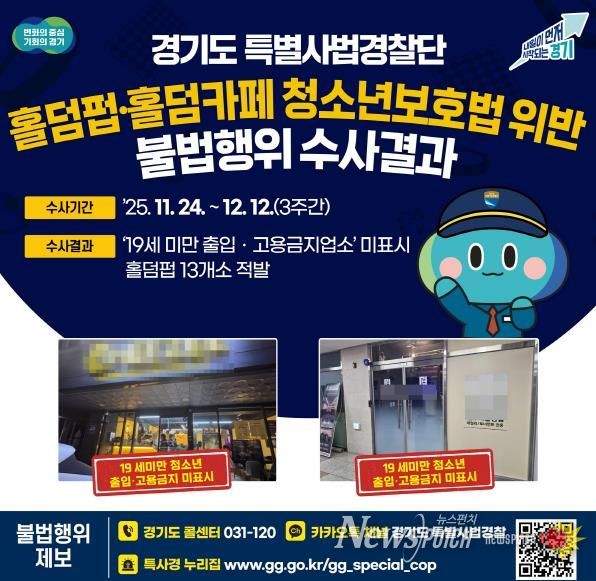 뉴스펀치 김길룡 기자 | 경기도가 청소년 출입이 금지된 홀덤펍, 홀덤카페 108개를 대상으로 불법행위를 집중 수사한 결과 ‘청소년보호법’ 위반 사업장 13개소를 적발했다.