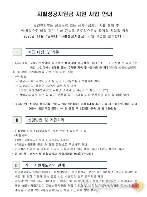 뉴스펀치 김길룡 기자 | 원주시는 오는 26일까지 2025년 ‘자활성공지원금’ 신청을 접수한다.