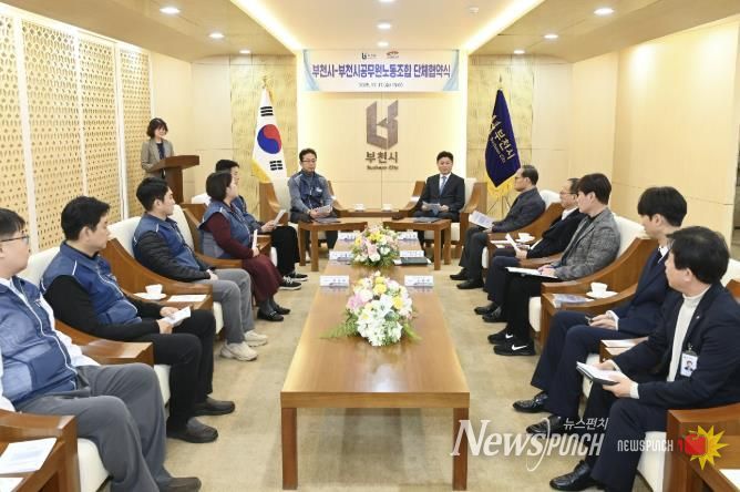 뉴스펀치 김길룡 기자 | 부천시는 지난 17일 시청 만남실에서 전국공무원노동조합 경기지역본부 부천시지부와 ‘2025년 단체교섭 협약식’을 진행했다.