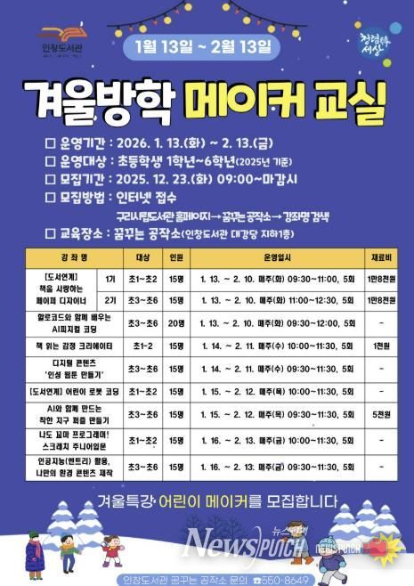 뉴스펀치 김길룡 기자 | 구리시 인창도서관 꿈꾸는 공작소는 다가오는 겨울방학을 맞아 초등학생을 대상으로 운영하는 ‘겨울방학 메이커 프로그램’의 참여자를 오는 2025년 12월 23일(화) 오전 9시부터 구리시립도서관(꿈꾸는 공작소) 홈페이지를 통해 선착순으로 모집한다고 밝혔다.