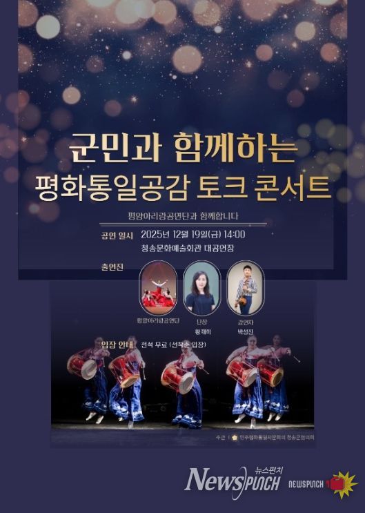 뉴스펀치 김길룡 기자 | 민주평화통일자문회의 청송군협의회는 오는 19일 오후 2시, 청송문화예술회관 대공연장에서 ‘군민과 함께하는 평화통일 공감 토크콘서트’를 개최한다고 밝혔다.