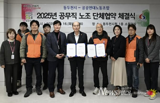뉴스펀치 김길룡 기자 | 동두천시와 공공연대노동조합 동두천지부는 지난 16일 동두천시청 1층 소회의실에서 2025년 공무직 노조 단체협약 체결식을 개최했다고 밝혔다.