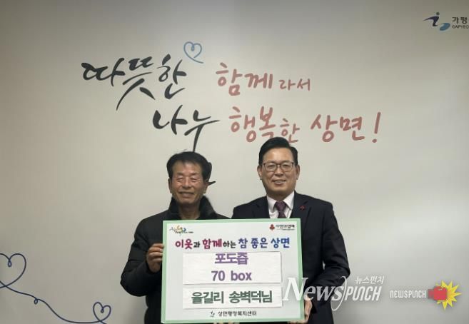 뉴스펀치 김길룡 기자 | 가평군 상면 농업인 송병덕씨는 직접 재배한 포도로 만든 포도즙 70박스를 17일 상면사무소에 기탁했다.