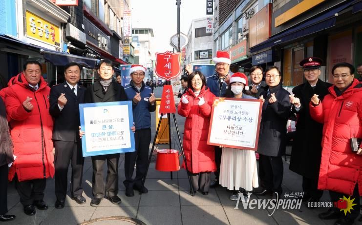 안성시는 행정안전부에서 열린 공무원 노사문화 우수행정기관 인증제 심사 결과 우수행정기관으로 선정되며 시상금 가운데 250만 원을 노사 공동 성금으로 마련해, 안성 명동거리에서 열린 ‘2025년 구세군 자선냄비 시종 행사’에서 기부했다.