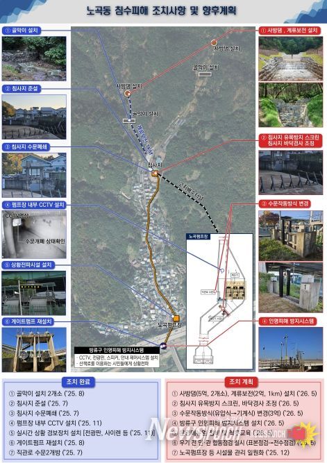 ②상류부 협잡물을 사전에 차단하기 위해 ▲사방댐 2개소 설치 ▲계류보전 1km 정비 등 환경 개선을 실시하며, ③재난 예경보시스템 강화를 위해 ▲펌프장 방류구에 인명피해 방지를 위한 CCTV, 전광판, 스피커 등 경보·안전 장치를 설치하고, ▲노곡펌프장 내 상황경보장치(전광판, 경광등, 싸이렌 등)를 설치해 위험 상황 시 주민들에게 신속한 안내가 가능하도록 예·경보 시스템을 보강할 계획이다.